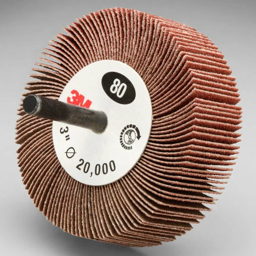 The 3M™ Flap Wheel, type 83 or type 84, is a general purpose flap wheel that delivers a consistent finish and uniform cut. Made of aluminum oxide on a firm, X-weight cloth backing, this product can be used in a variety of grinding and polishing applications. Aluminum oxide is a popular choice among industrial professionals because of its fast cut-rate and long life. This mineral makes a tough, durable abrasive that self-fractures to expose fresh cutting edges, whereas traditional natural abrasives dull more quickly. Due to its fast cut-rate, hardness, and strength, it is widely used in grinding applications in addition to sanding and finishing applications. The 3M™ Flap Wheel, type 83 or type 84, is long lasting, fast cutting and resin bonded for heat resistance. It also features a straight spindle mount for easy attachment. For use with bench motors, die grinders and inline sanders.