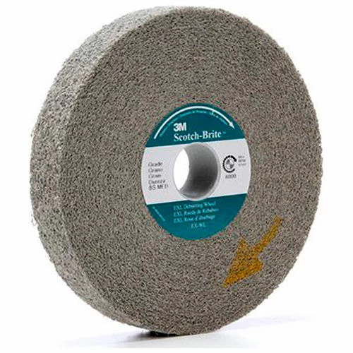 The finished result is a clean surface without smearing, reducing the need for additional clean up and preparation. Convolute construction and clean, uniform wear keep the wheel running smoothly and help the operator attain a professional finish while minimizing fatigue. Our Scotch-Brite material runs cool and provides the EXL Deburring Wheel with uniform wear and keeps fresh abrasives continuously exposed, making it a superior choice on heat sensitive substrates. The toughness of the wheel extends its service life. Scotch-Brite™ EXL Deburring Wheel is available with silicon carbide or aluminum oxide abrasive mineral. Silicon carbide is a synthetic mineral that is very sharp and commonly used for low-pressure applications such as paint prep and finishing. Aluminum oxide is a hard, blocky mineral that provides high cut-rate and long life. While silicon carbide breaks down faster than aluminum oxide, it produces a finer finish. Scotch-Brite™ is a unique surface conditioning product with abrasives incorporated into non-woven nylon fibers. Combining abrasives with the fibers creates an abrasive system that delivers consistent results for the life of the product. The open-web material is load resistant and keeps the abrasive minerals cutting at high performance by limiting clogging of the nylon fibers.