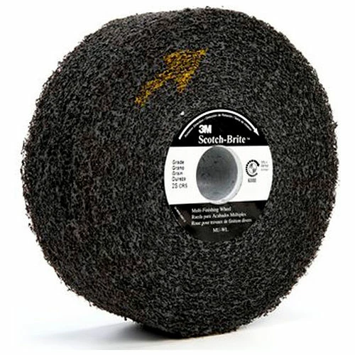 Our Scotch-Brite™ Multi-Finishing Wheel is ideal for producing #3 or #4 finishes on stainless steel and other metals on curved, contoured, and flat surfaces. The Multi-Finishing Wheel runs cool and resists loading due to its open-web construction, reducing the risk of part discoloration and warping while extending the life of the wheel. The Multi-Finishing Wheel is available in coarse, medium, and fine grade abrasive. Our Scotch-Brite™ Multi-Finishing Wheel uses silicon carbide abrasive. Silicon carbide is a synthetic mineral that is very sharp and commonly used for low-pressure applications such as paint prep. While it breaks down faster than aluminum oxide, it produces a superior finish. Scotch-Brite™ industrial abrasives are unique surface conditioning products with abrasives incorporated into non-woven nylon or synthetic fibers. Combining abrasives with the fibers creates an abrasive system that delivers consistent results for the life of the product. We chose an open-web material that runs cool and is load resistant, which keeps the abrasive minerals cutting at high performance by limiting clogging of the fibers.