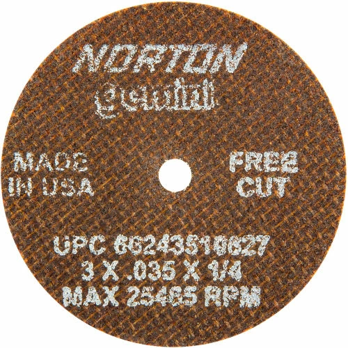 The Norton small diameter cut-off wheel line consists of Type 01, Type 01/41 straight and Type 27/42 depressed center cut-off wheels from 1-1/2″ to 9″ diameters. These wheels come in ultra thin .035 for quick burn-free and burr-free cutting to .125″ for more durable applications. All are reinforced for the demanding nature of portable cut-off.Quality A/O -For cutting alloys, teels/ferrous metals -Full fiberglass reinforcement-Straight, stable cuts. Fast, burr-free cutting, low kerf loss.