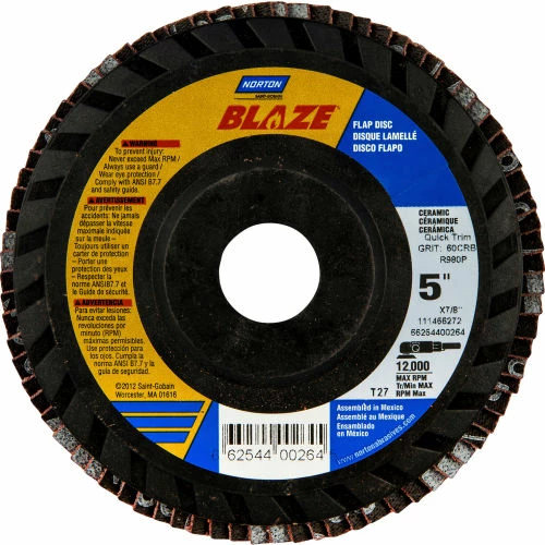 Norton 66254400519 Blaze Plastic Flat Flap Disc T27 5" x 7/8" 120 Grit Seeded Gel Ceramic – Pkg Qty 10