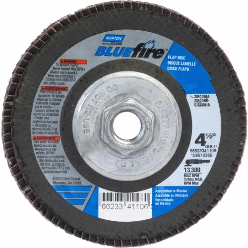Norton 66254461173 BlueFire Fiberglass Conical Flap Disc T29 4-1/2" x 5/8 – 11" P80 Zirconia Alum. – Pkg Qty 10